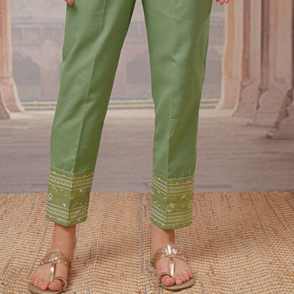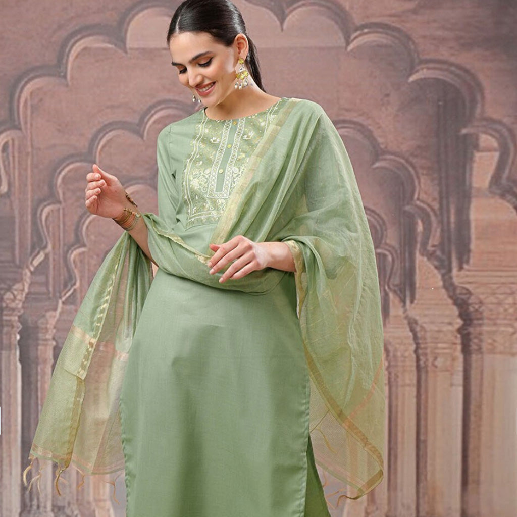 Introducing our 3-piece churidar set which consists of a kurtha top, wide-leg pants and a dupatta. This refreshing green color is perfect for outdoor parties and festive gatherings!