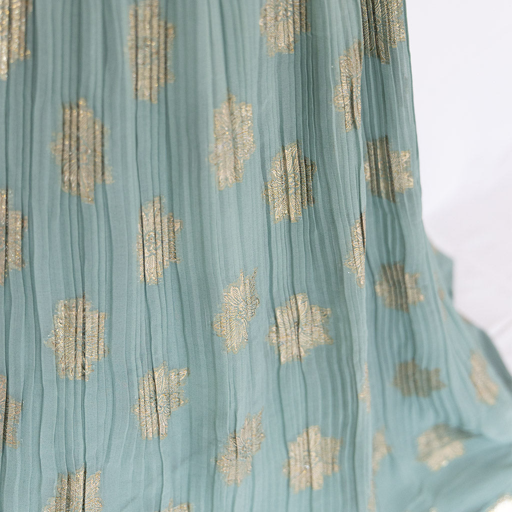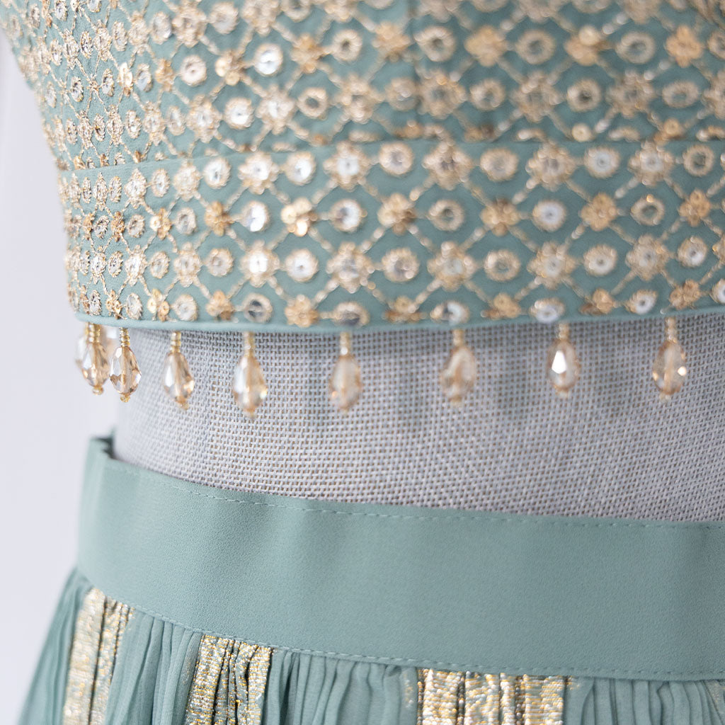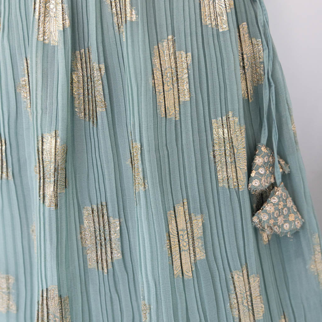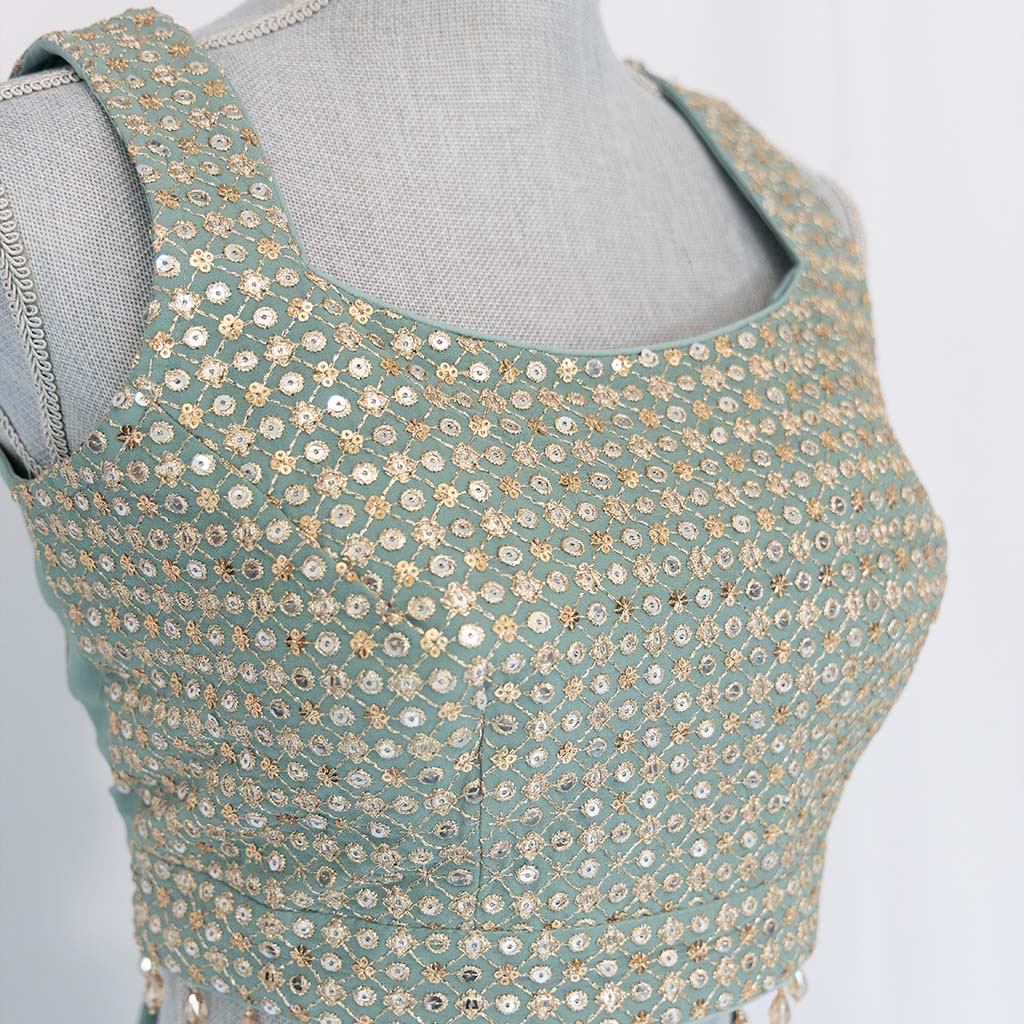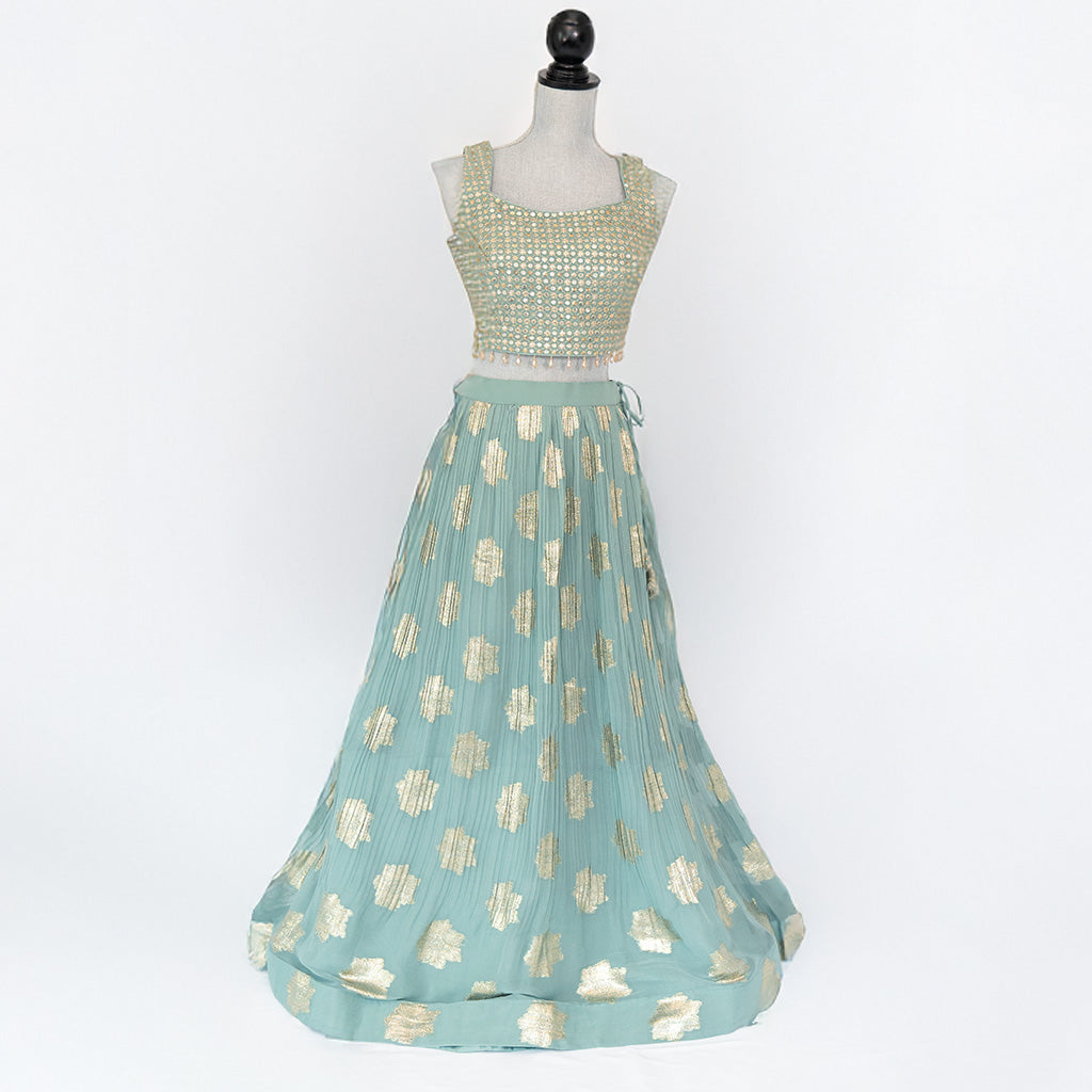 How gorgeous is this aqua blue lehenga set?! This 3 piece lehenga consists of a skirt, sleeveless blouse and a dupatta. The sequin top along with the beautiful foil print on the skirt compliment each other to perfection.