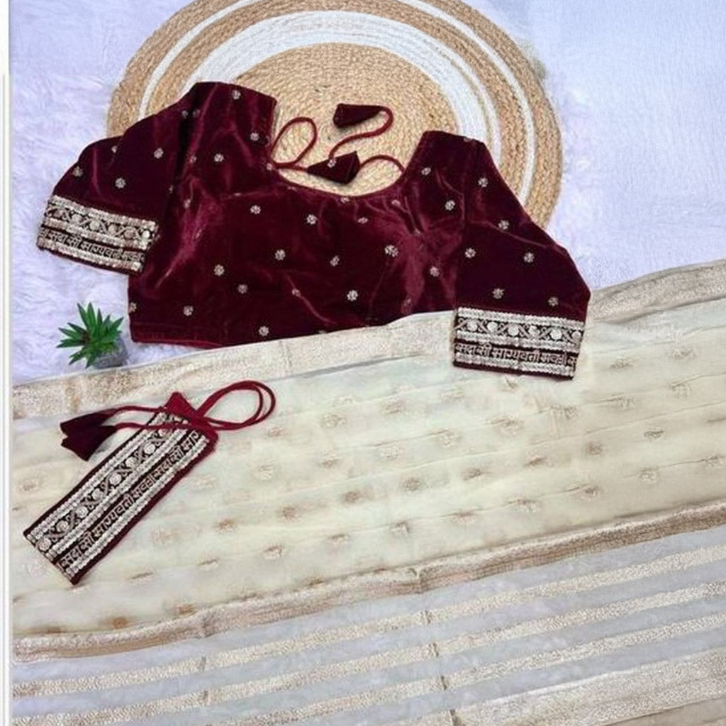 This 3 piece georgette saree has a stunning banarasi border and comes with a complementary stitched velvet blouse and a velvet belt.