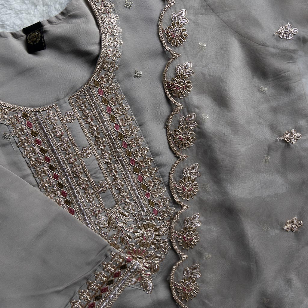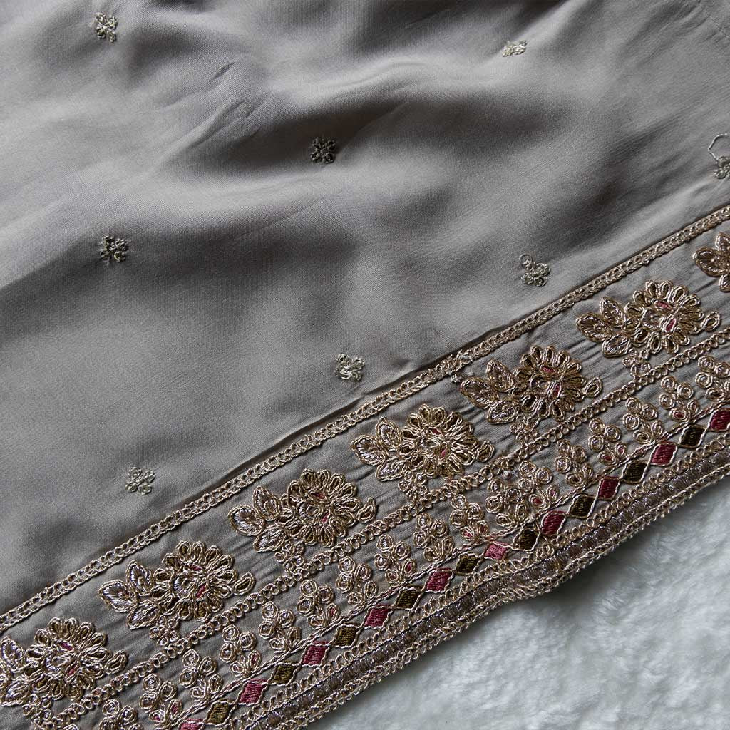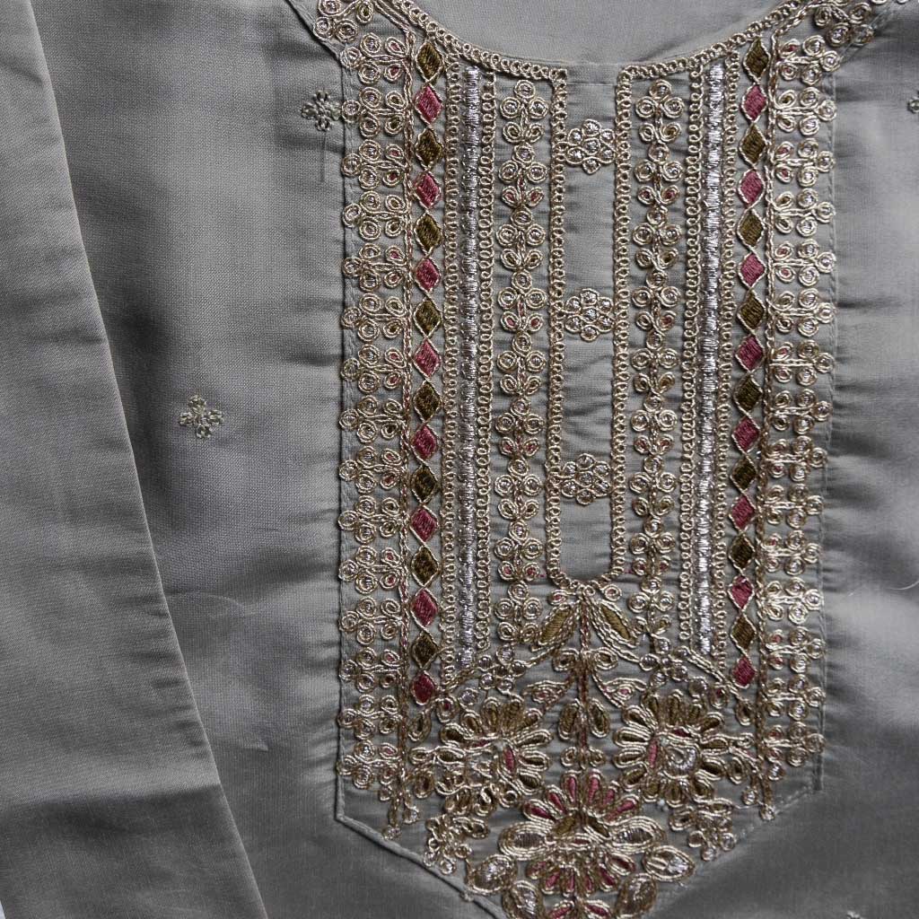 This elegant grey churidar 3-piece set is made from a silky-polyester blend for ultimate comfort and style. The embroidered set features intricate details on the neckline, arm cuffs, and hem. Paired with straight-leg pants for a flattering fit, it offers a comfortable look and feel. The scallop-border dupatta completes the ensemble, adding a touch of grace.