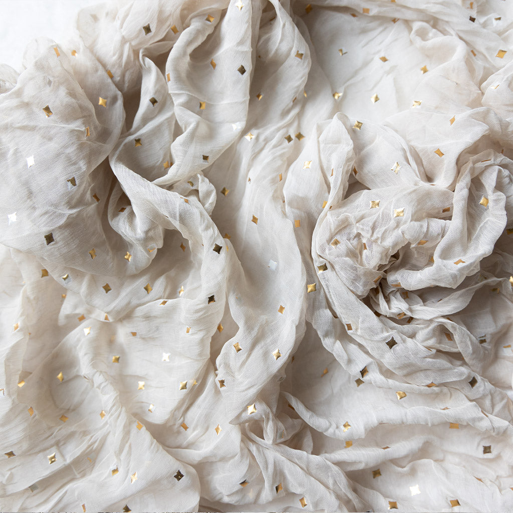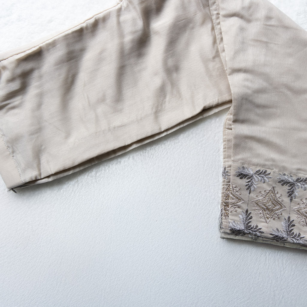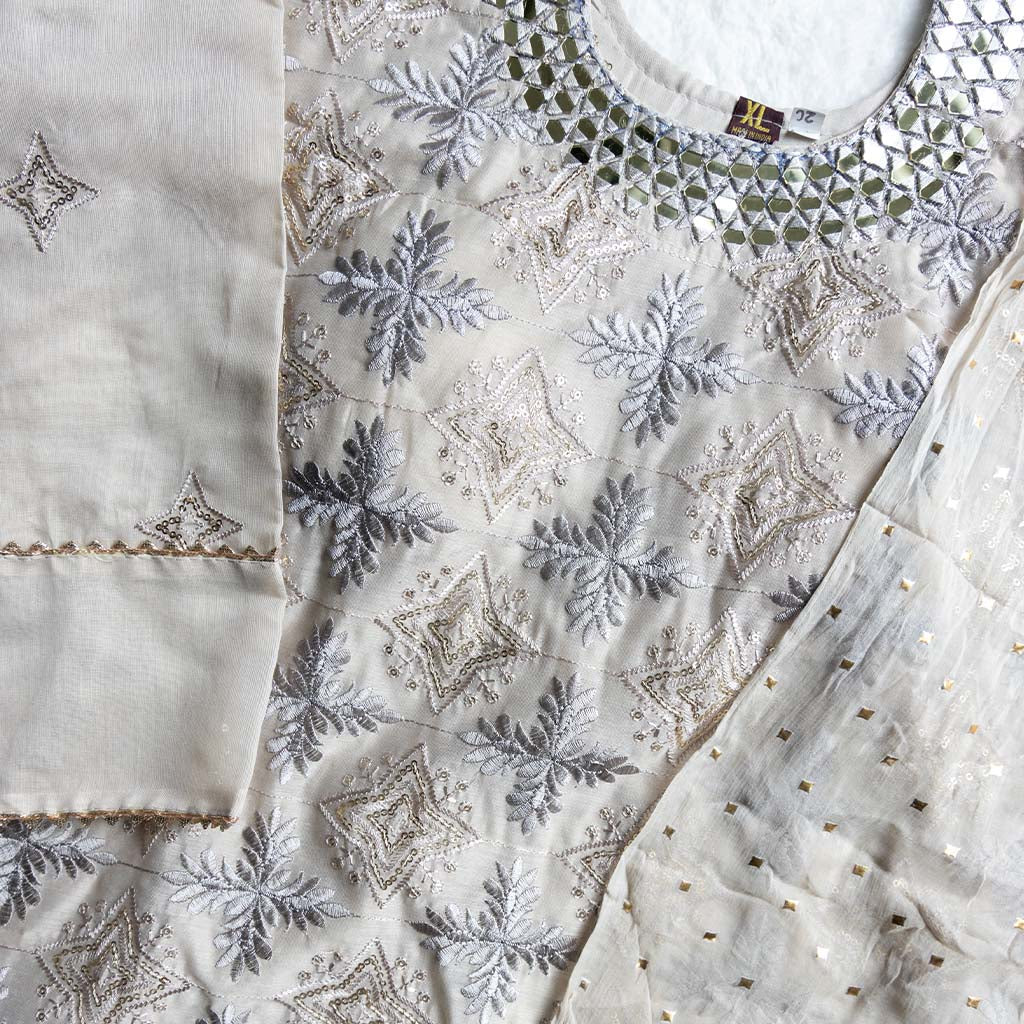 This 3-piece beige churidar set includes a padded, straight-cut top with mirror neckline details and intricate embroidery throughout, finished with a delicate trim on the sleeves. The soft dupatta features golden accents for a subtle shimmer. The pants have an embroidered trim matching the top and a clasp waist for a secure fit. Perfectly crafted for comfort and style.