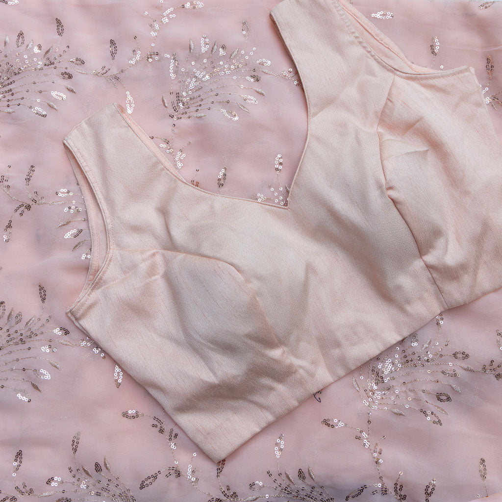 How gorgeous is this peach toned georgette saree?! The beautiful floral embellishment is the perfect addition to borderless elegance.