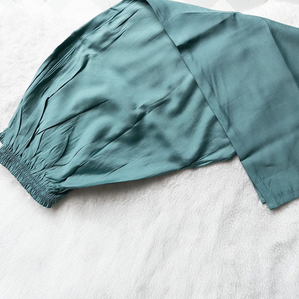 This stunning outfit comes in a aqua blue color and features a top with gorgeous sequin details on the neckline and chest for a little extra sparkle. The dupatta has scalloped edges, adding a fun touch, and the tapered pants give you a flattering fit. Perfect for any celebration, this outfit combines comfort and style, making it a must-have for your wardrobe!