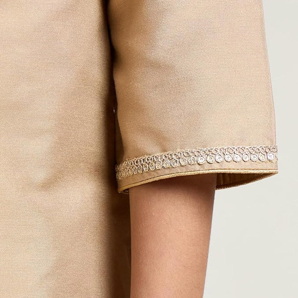 This stunning embroidered set includes a soft, 3-piece ensemble featuring a kurta top with intricate sequin and zari detailing, organza dupatta with delicate scallop-edge zari embroidery and an elasticated waist to ensure a perfect fit for all-day comfort. Whether it's a wedding, family celebration, or special event, this churidar set makes a perfect ensemble for your little one.Â