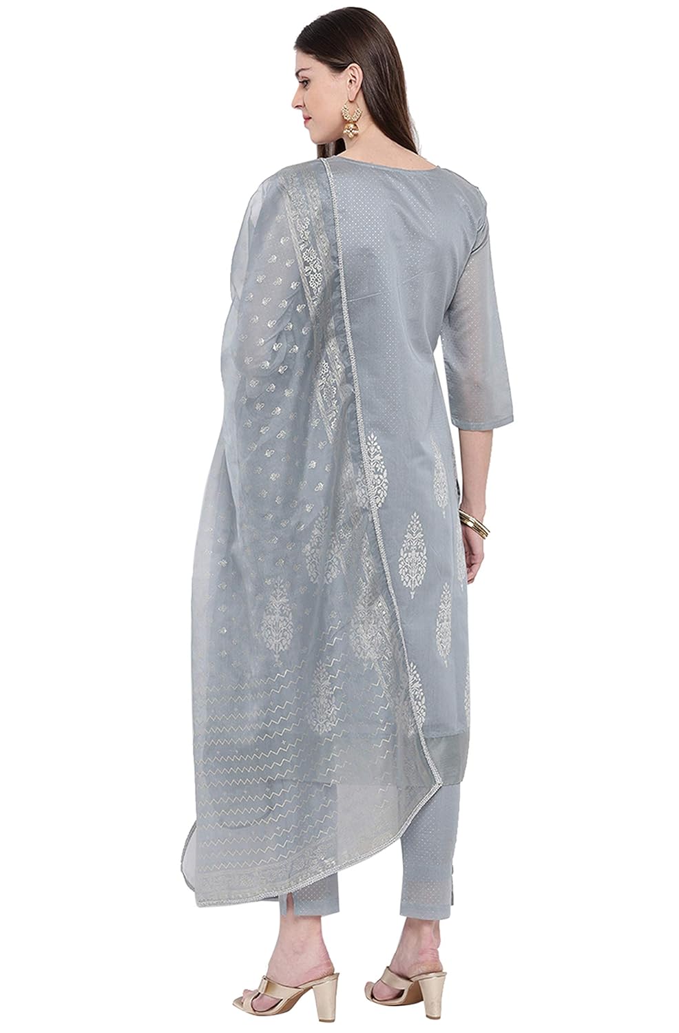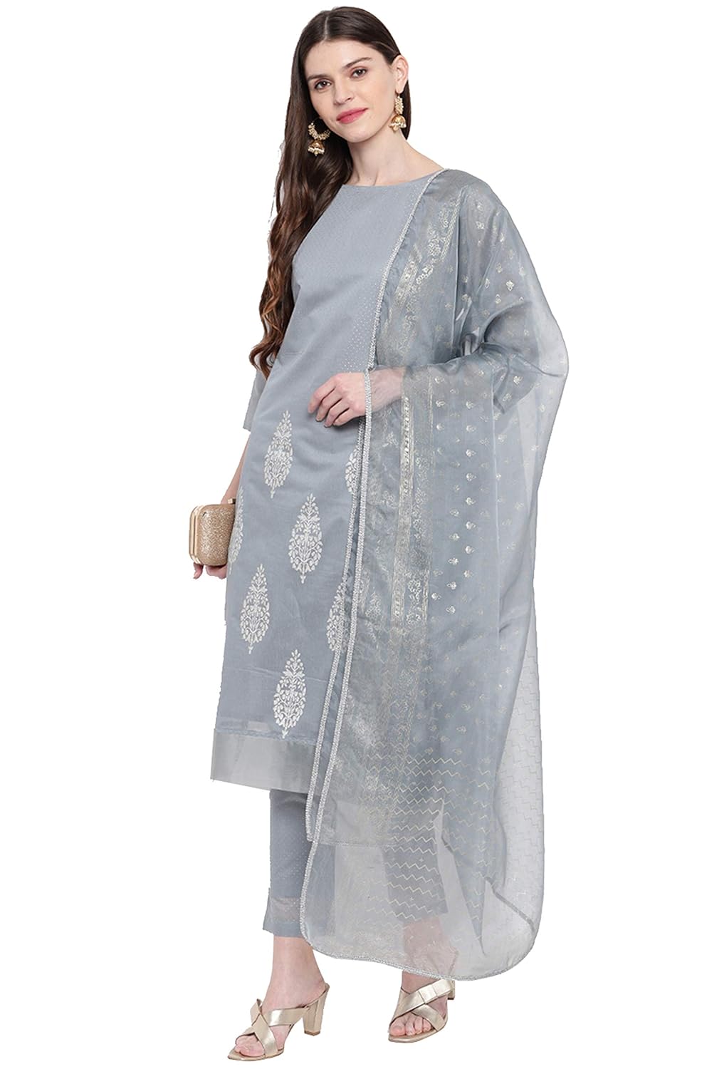 This icy-blue grey set is perfect for winter! The 3-piece churidar set features a grey top, tapered pants and a beautiful organza dupatta. The kurtha top contains dotted pattern at the top and a unique tree print at the bottom. To top it all, the pants are tapered and comes with POCKETS!