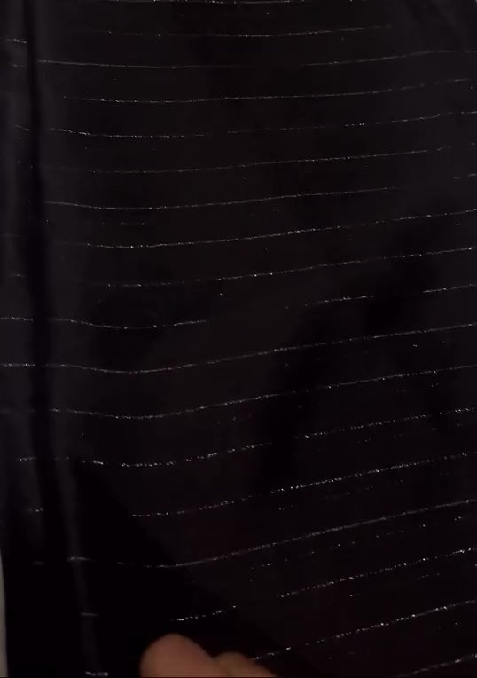 How gorgeous is this all black georgette saree?! This saree features horizontal silver lines, making it perfect for all parties!