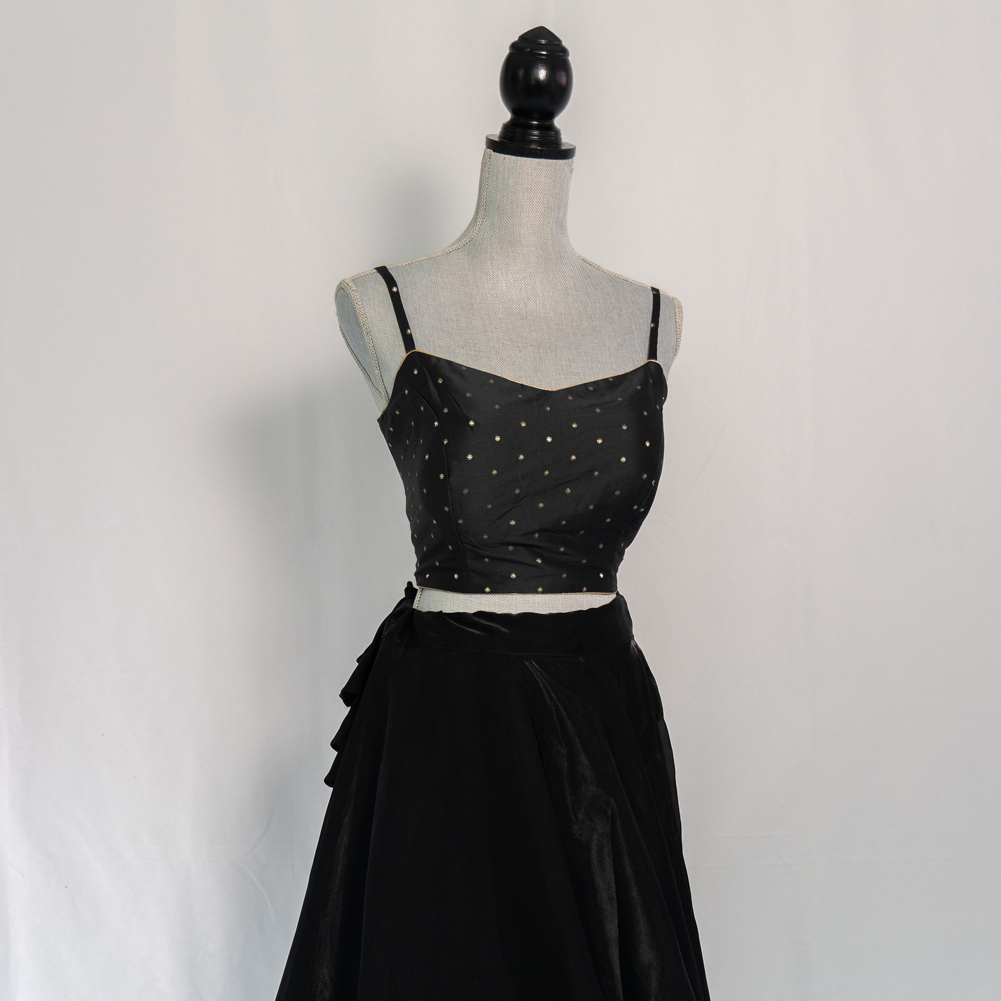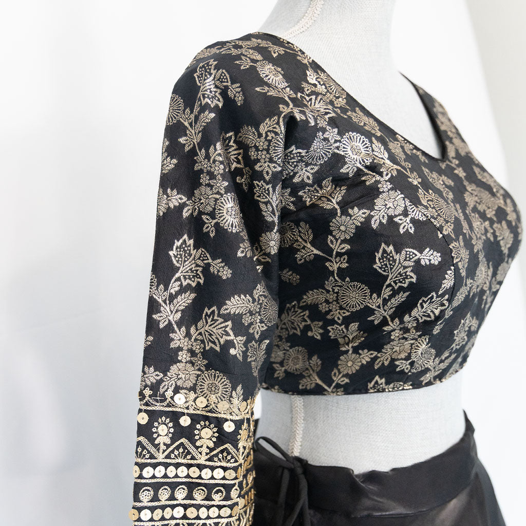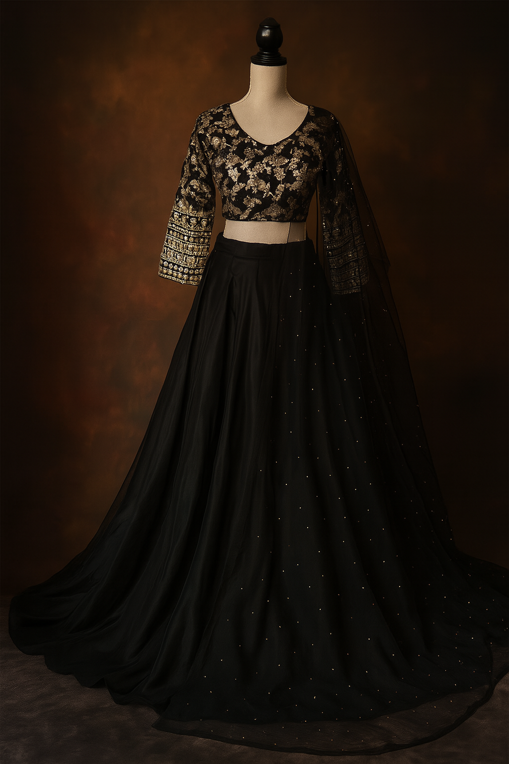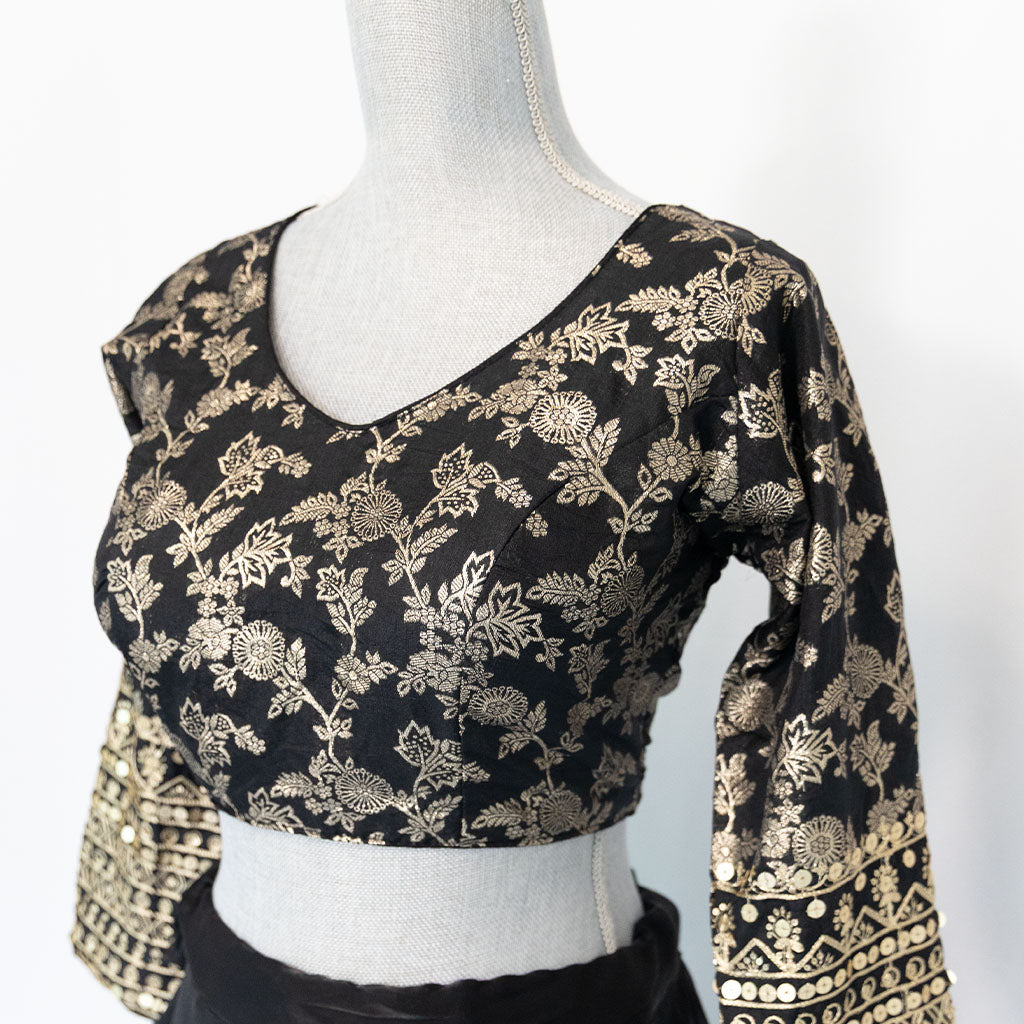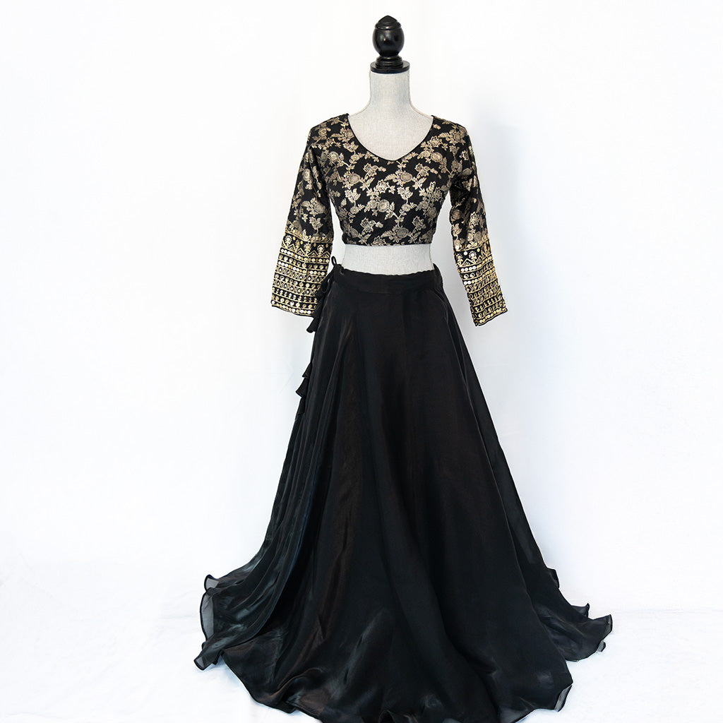 This 3 piece lehenga consists of a skirt, three-quarter sleeve blouse and a dupatta. The sparkles on the dupatta complement the coppery-gold work on the blouse. The skirt is extremely lightweight and flowy! It is versatile, making it a perfect addition to your closet.