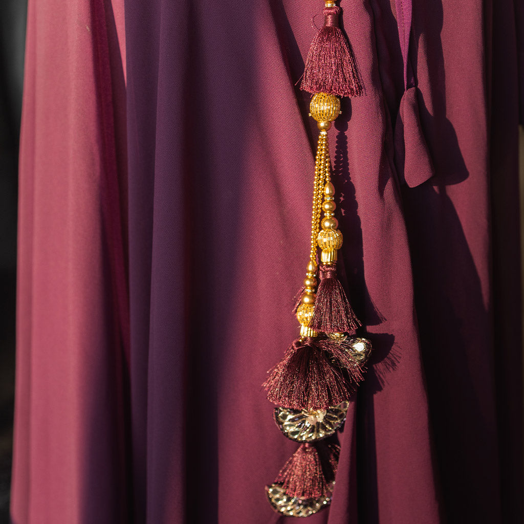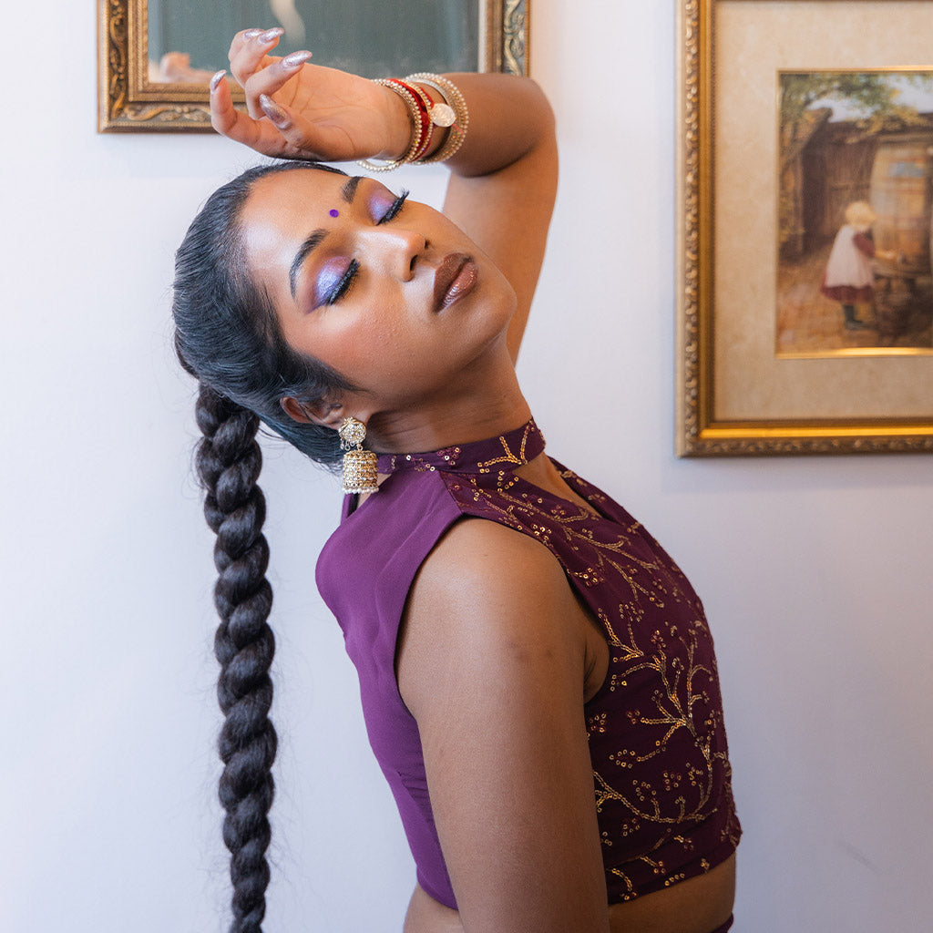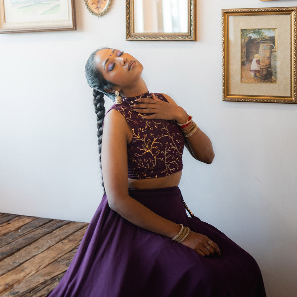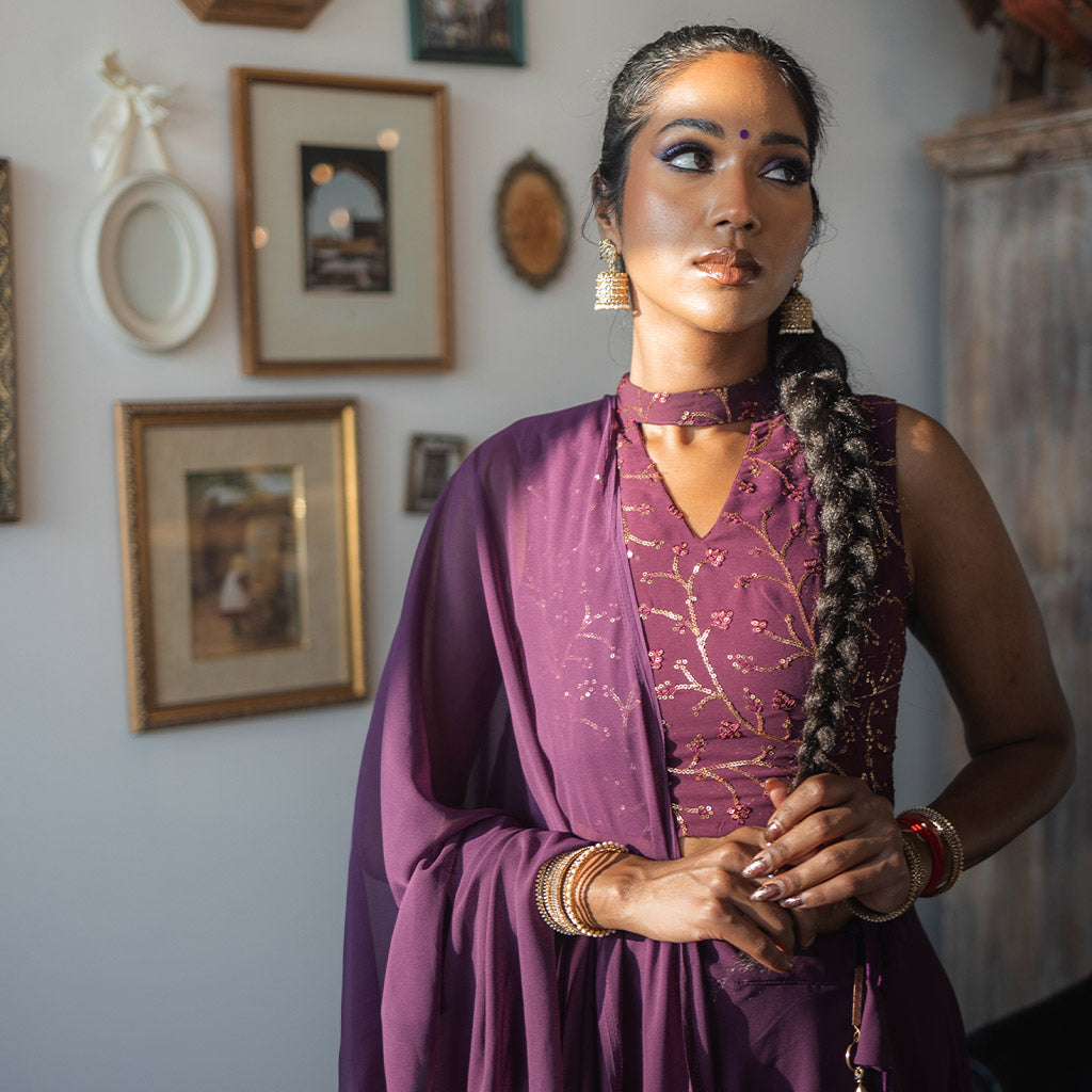 This flowy 3-piece lehenga set features a purple sequin blouse with a purple georgette skirt and dupatta. The small sequin work details add a touch of elegance, making it perfect for birthday parties to receptions!
