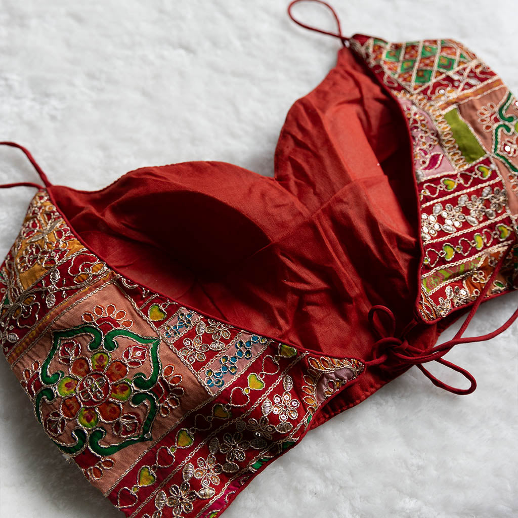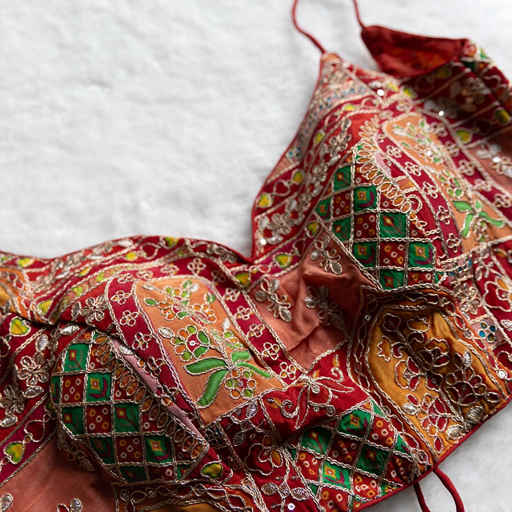This flowy 3-piece lehenga set features a red blouse, yellow skirt and a cotton dupatta. The small mirror work details add a touch of elegance, making it perfect for haldi and mehendi events!